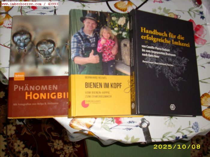 - Phänomen Honigbiene, Prof. Tautz, -Bienen im Kopf, B.Heuvel, - Handbuch für die erfolgreiche Imkerei, Autorenkollektiv mit Kommentaren von Hans Beer, je Buch 25€ versandkostenfrei, bei Abnahme aller drei Bücher 70€.