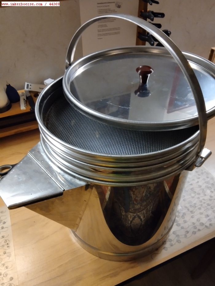 Biete einen Abfülleimer (Edelstahl) mit einem Grob- und Feinsieb sowie Deckel.