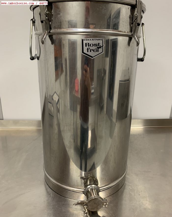 Biete Abfüllkanne für 50kg Honig aus Edelstahl, gebraucht, guter Zustand, mit Quetschhahn und Schnappverschlüssen, 60€