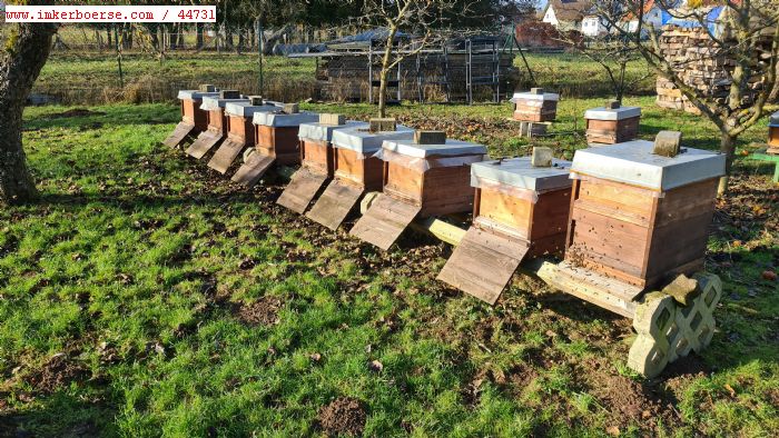 Verkauft werden 11 W.-völker im Liebig-Zander-System (13 Komplettbeuten) mit viel, gepflegter Ausstattung (max. 3 Jahre alt). Die Völker sind vital, sanftmütig und gut aus dem Winter gekommen. Dokumentation, Futterkranzprobe, Gesundheitszeugnis.