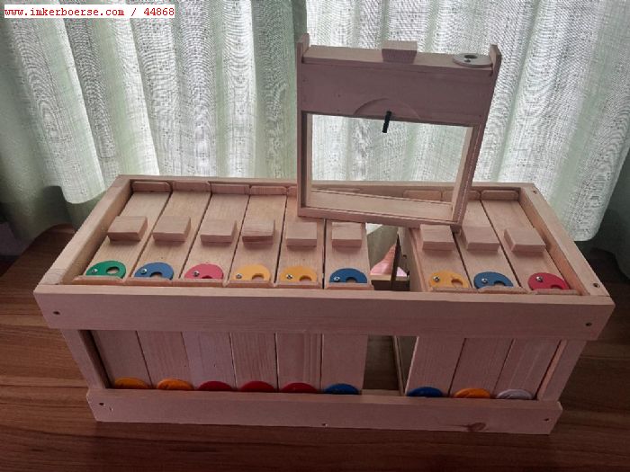 Wir bieten 10 Beuten inklusive Absperrgitter, Varroaschublade, 2 Honigräumen, Trennschied und Bienenflucht.