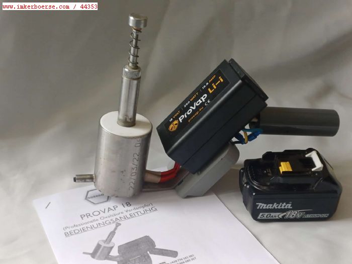 Verkaufe aus Imkerei-Auflösung einen Vaporizer "Provap" für den Betrieb mit einem Makita-Werkzeugakku. Das Gerät ist neuwertig, gekauft 2022 und wenig benutzt.