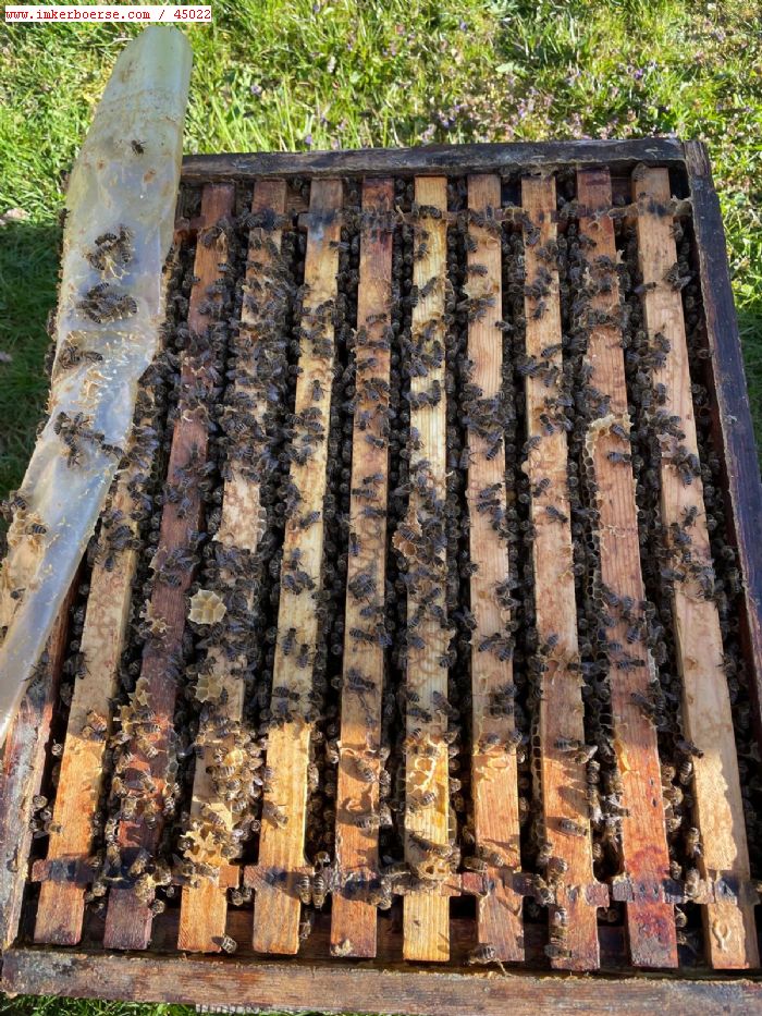 Verkaufe 2 belegstellenbegattete Carnicavölker auf Zander. Sehr friedlich, Königinnen unbegattet in Mayen gekauft, auf Belegstelle Plattling begattet, gezeichnet, Kunstschwärme auf einer Zarge überwintert. Eigener Wachskreislauf, nur organische Mittel zur Varroabehandlung….Preis pro Volk ohne Kasten 150€.