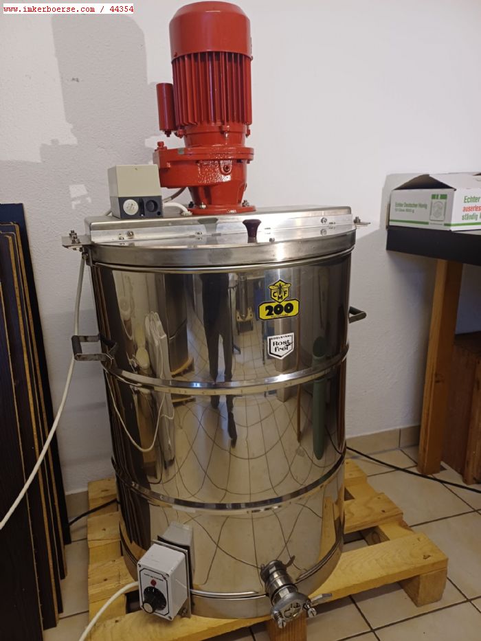 Biete hier aus Imkerei-Auflösung ein 200kg fassendes Rührgerät aus Edelstahl, Hersteller Carl Fritz, mit geregelter Bodenheizung Dana api Therma. 230 Volt Motor mit Schutzschalter.